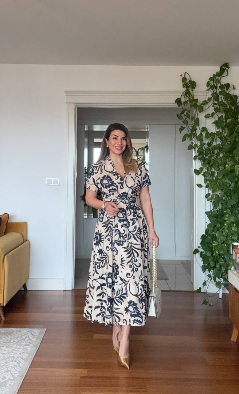 Zarafet ve Konforun Buluştuğu Nokta: Desenli Kruvaze Midi Elbise