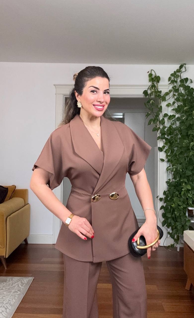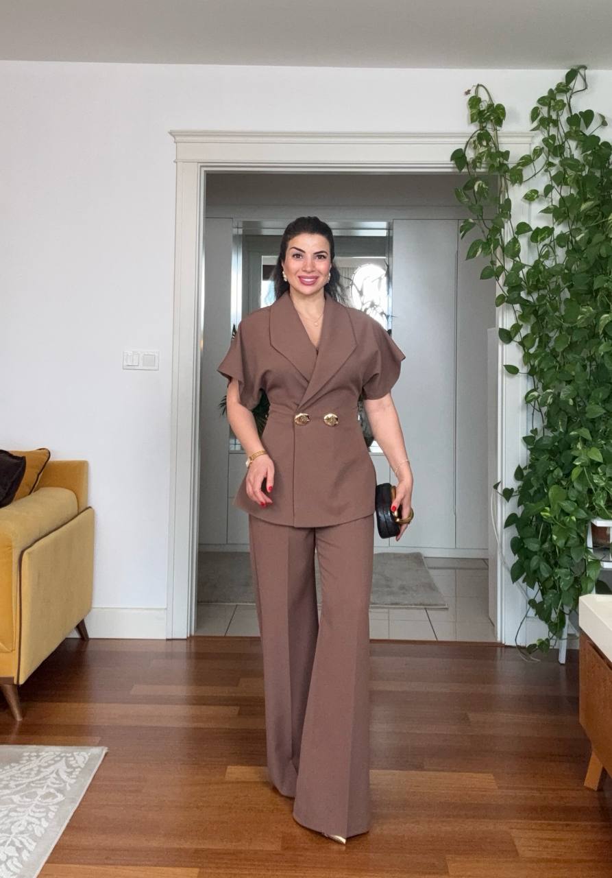 Şıklığı ve konforu bir arada sunan bu moka kahve takım, kısa kollu kruvaze ceket tasarımı ve yüksek bel bol paça pantolonu ile sofistike bir stil oluşturur. Gold düğme detayları tasarıma lüks bir dokunuş katarken, belden oturan kalıbı feminen bir siluet sağlar.