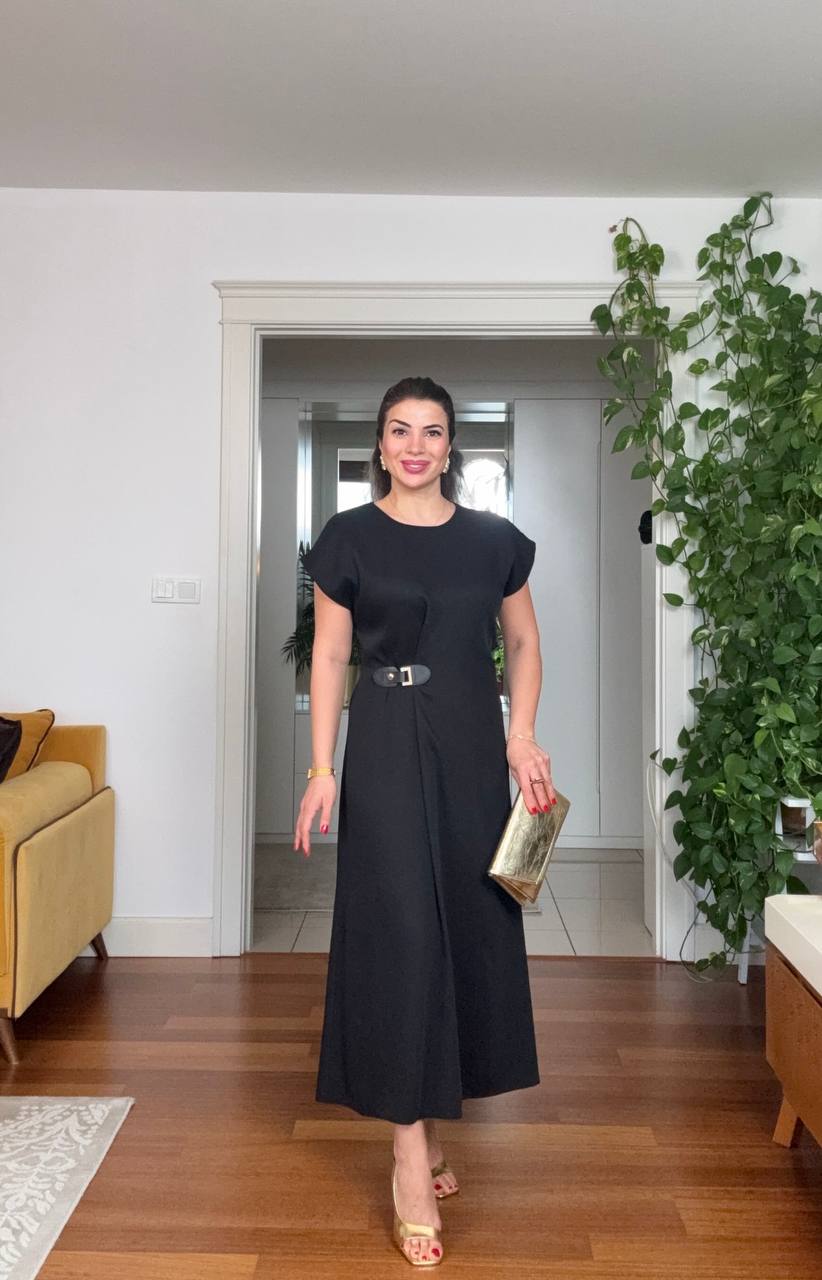 Minimal tasarımı gold toka detayıyla buluşturan bu siyah midi elbise, sade ama etkileyici bir stil sunar. Bel kısmındaki gold aksesuar, vücut formunu zarifçe vurgularken elbiseye modern ve sofistike bir hava kazandırır.
