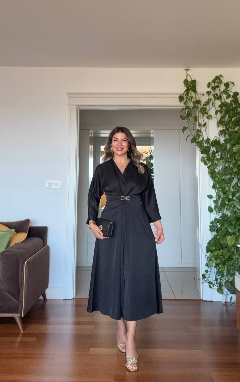 Zamansız siyahın asaletini modern dokunuşlarla buluşturan bu midi elbise, stilinizi her ortamda ön plana çıkarır.