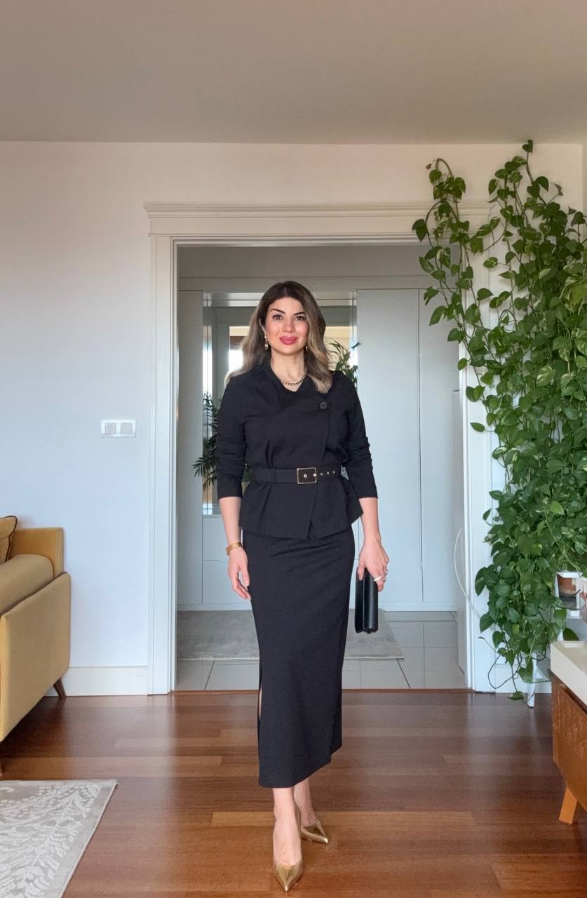 Zamansız şıklığı modern bir dokunuşla buluşturan bu siyah takım, güçlü ve zarif bir stil arayan kadınlar için tasarlandı. Asimetrik düğme detayına sahip ceket, bel kısmındaki kemer detayıyla vücut formunu zarifçe vurgularken feminen bir siluet oluşturur. Uzun etek tasarımı ise sade ve sofistike bir duruş sunar.