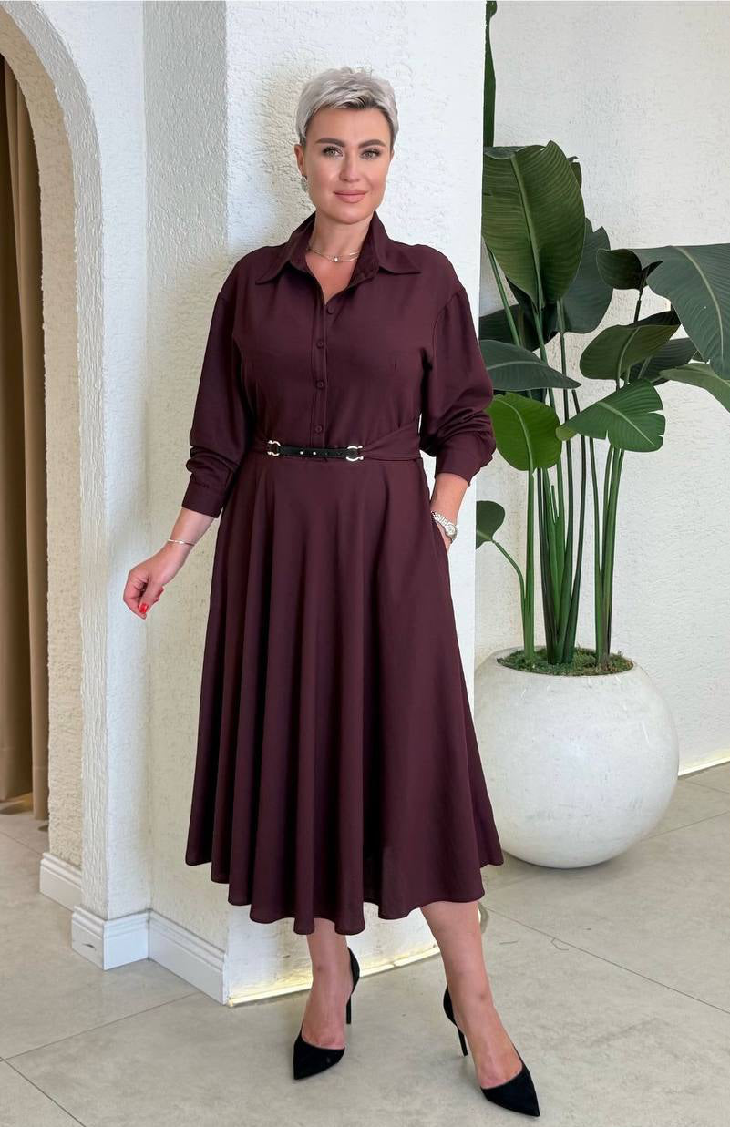 KEMER DETAYLI GÖMLEK YAKA DÖKÜMLÜ MİDİ ELBİSE – BORDO (Büyük Beden)