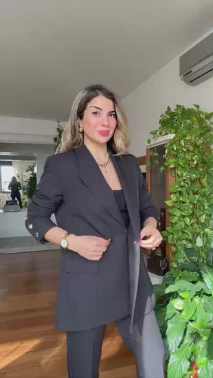 Gold düğme detaylarıyla zenginleştirilen blazer ceket, oversize kesimi sayesinde şık bir duruş sergilerken aynı zamanda rahat bir kullanım sağlar. Takımın düz kesim pantolonu ise vücut formunu ideal şekilde tamamlayarak kusursuz bir siluet oluşturur.