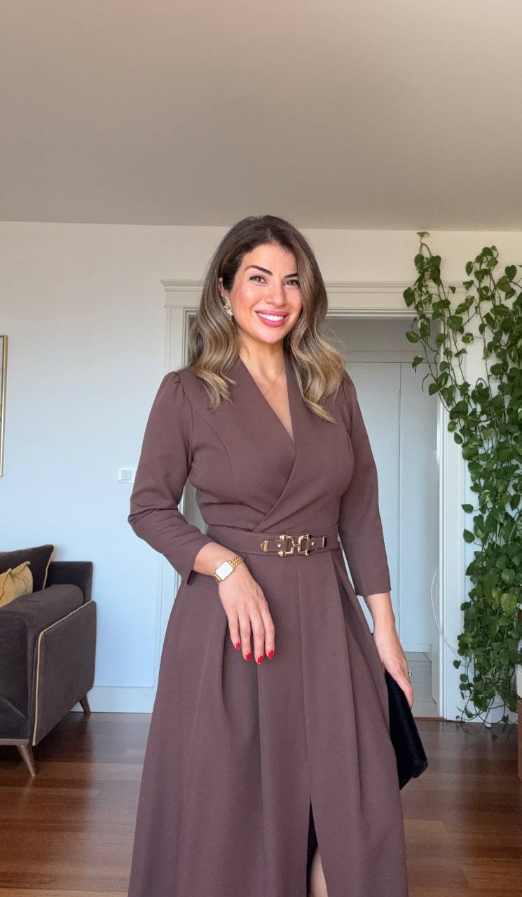 KRUVAZE YAKA KEMERLİ MİDİ ELBİSE - KAHVE