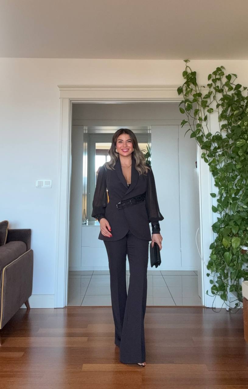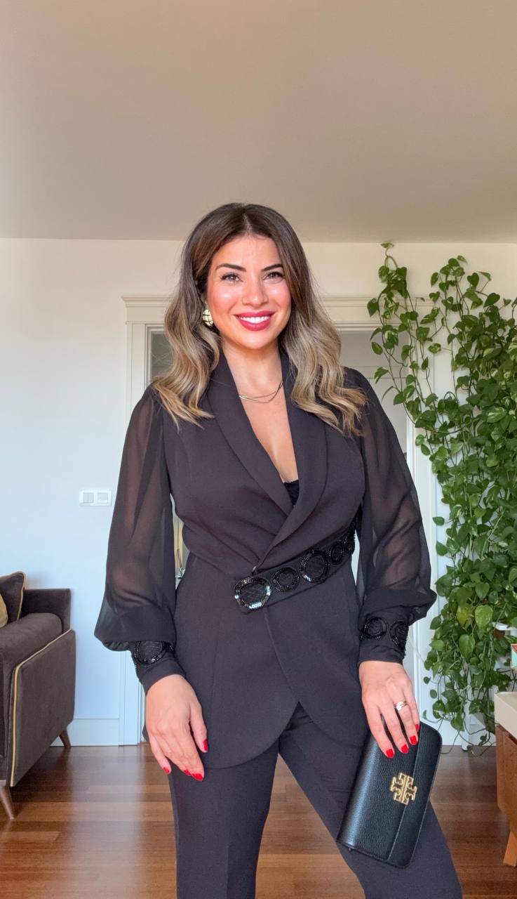 • Ceket Tasarımı: Kruvaze yaka, şifon uzun kollar ve belden oturtmalı form ile zarif bir görünüm.