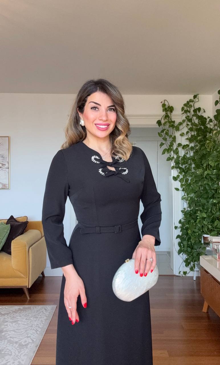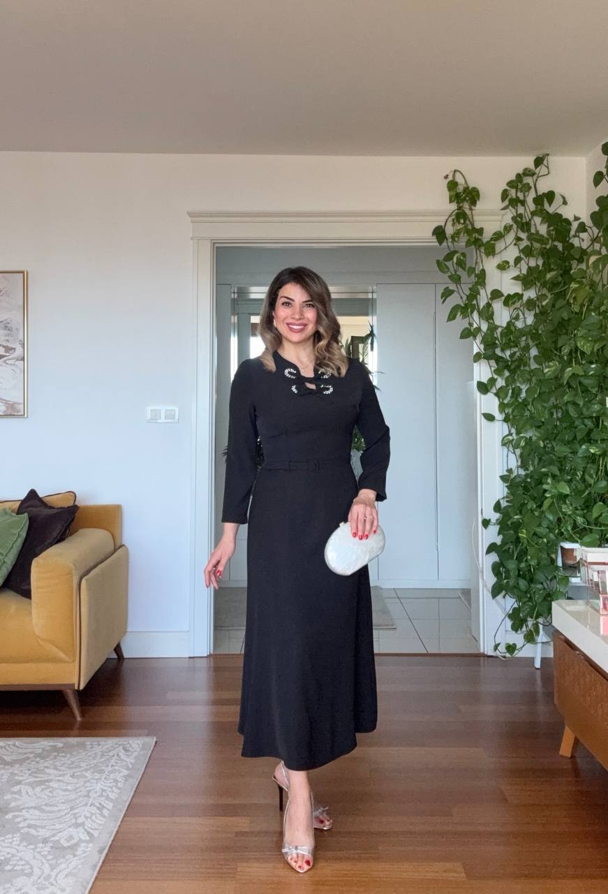 Zamansız siyahın asaleti, modern detaylarla buluşuyor. Taş detaylı yaka tasarımı ve zarif kesimiyle öne çıkan bu uzun elbise, özel günlerde şıklığı garanti eder.