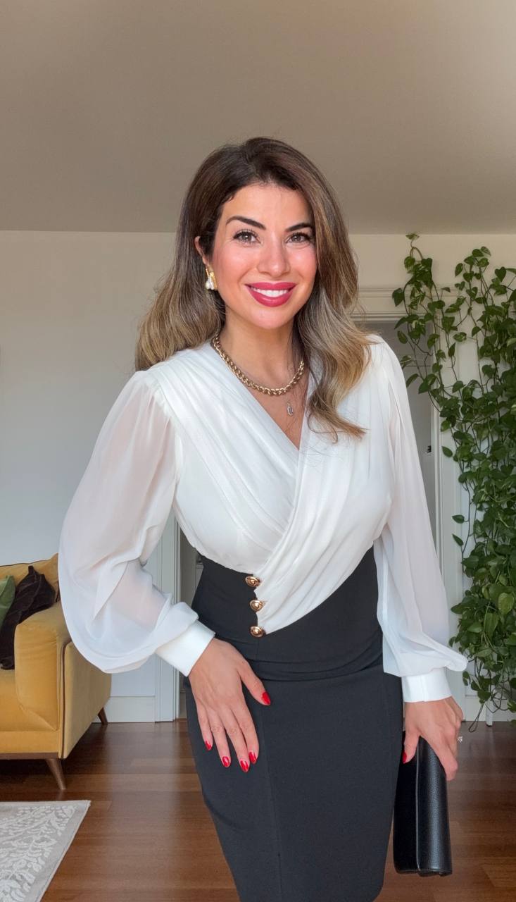 • Üst Kısım: Kruvaze yaka, şifon uzun kollar ve zarif manşet detaylarıyla feminen bir duruş sunar.