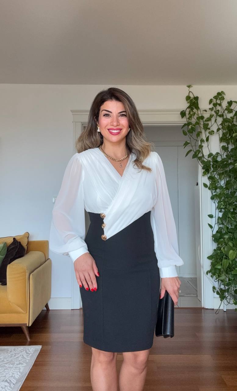 ÜÇ DÜĞME DETAYLI KRUVAZE ELBİSE - SİYAH & BEYAZ